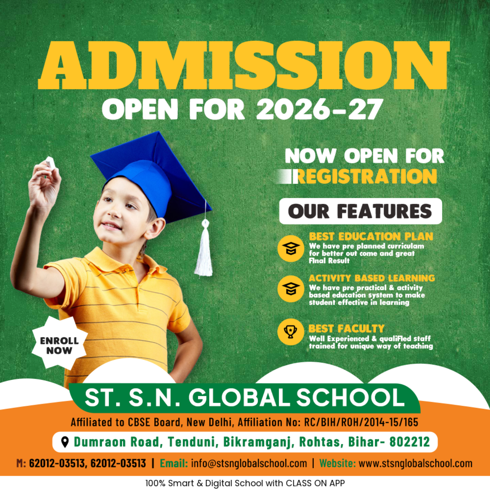 ST. S.N. Global School is known for its modern classrooms, qualified teachers, strong academics, value-based education, and safe campus, making it one of the top schools in Bikramganj.
